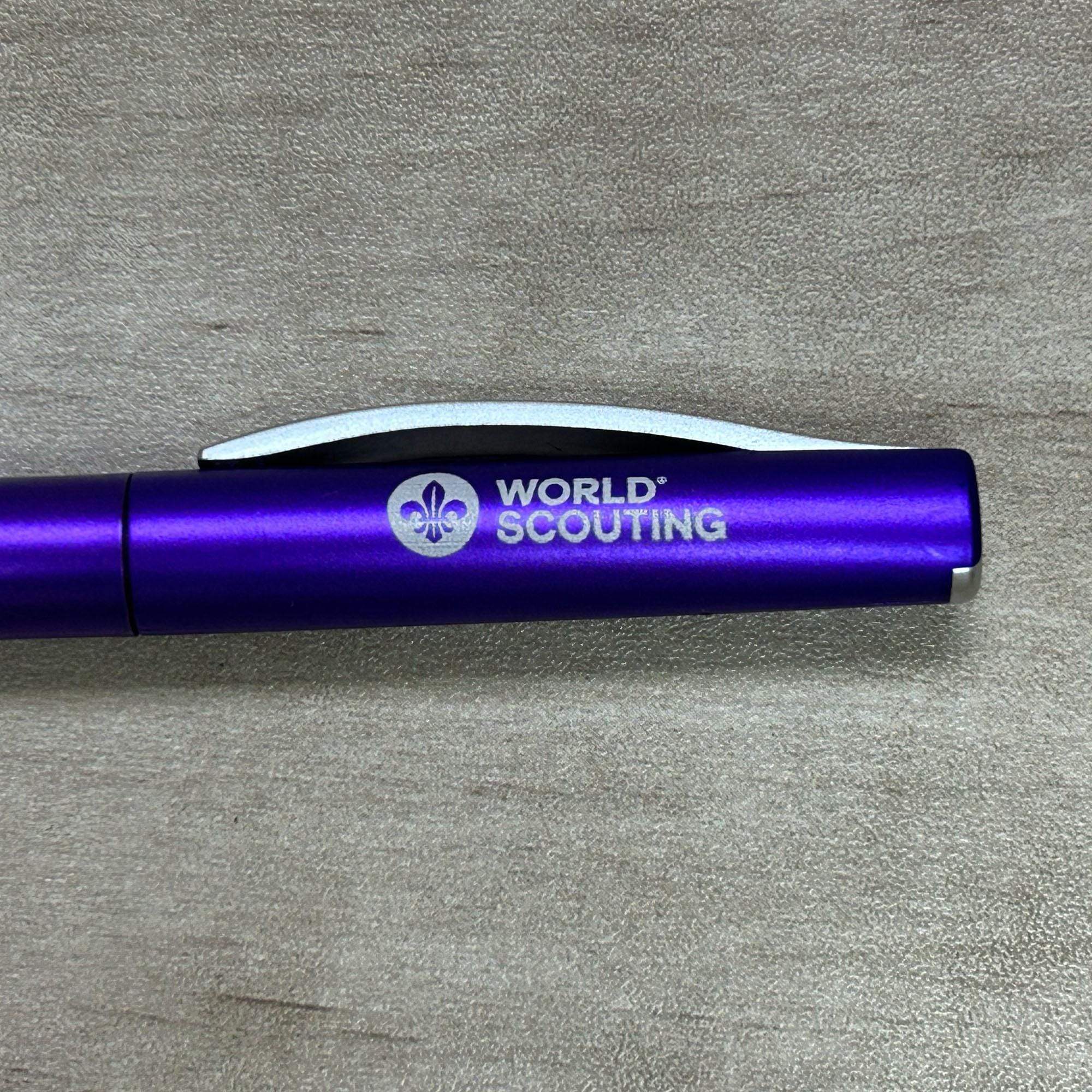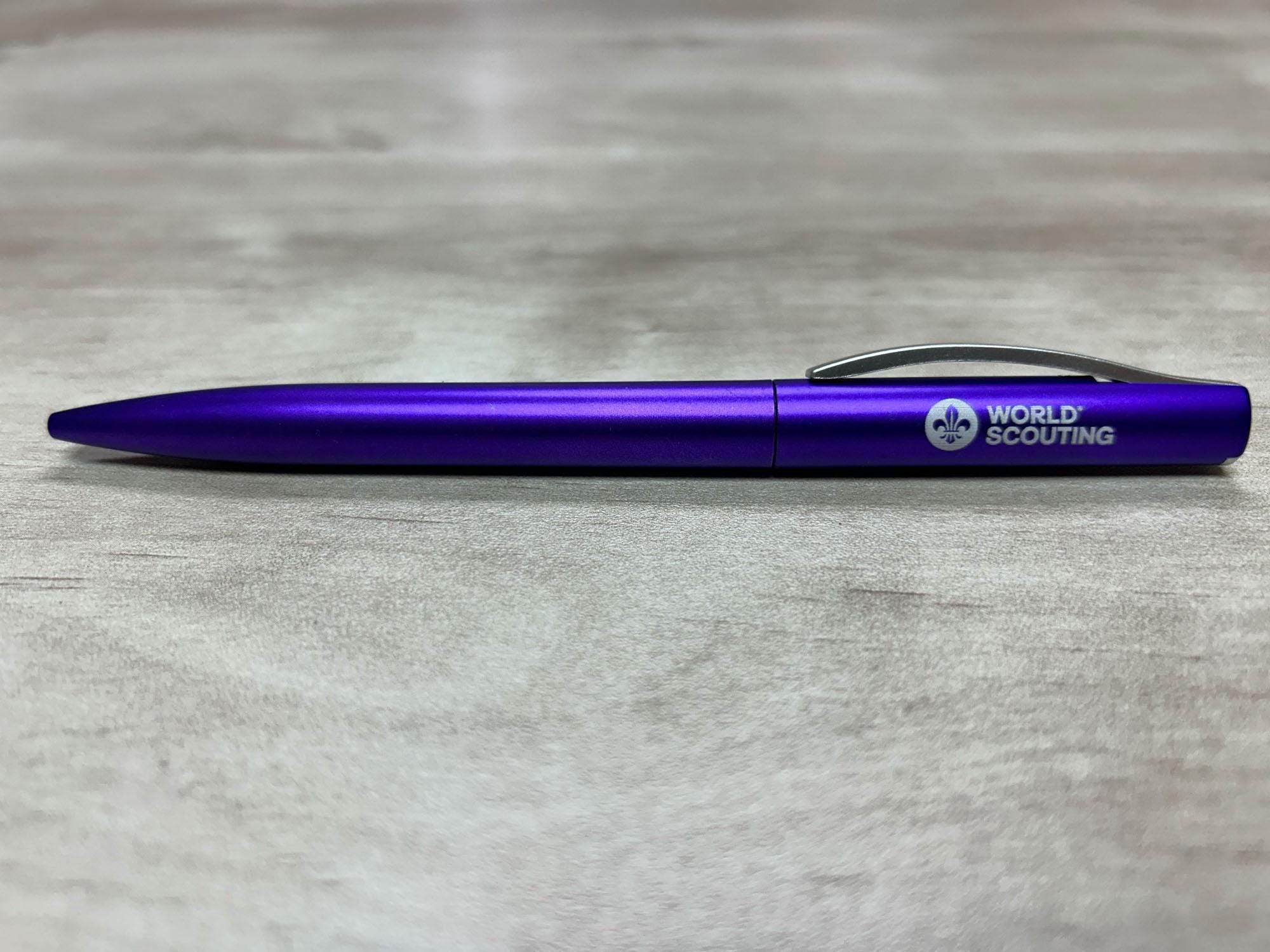 This is the NEW World Scouting Purple Metal Pen featuring an engraved new World Scouting logo on one side.